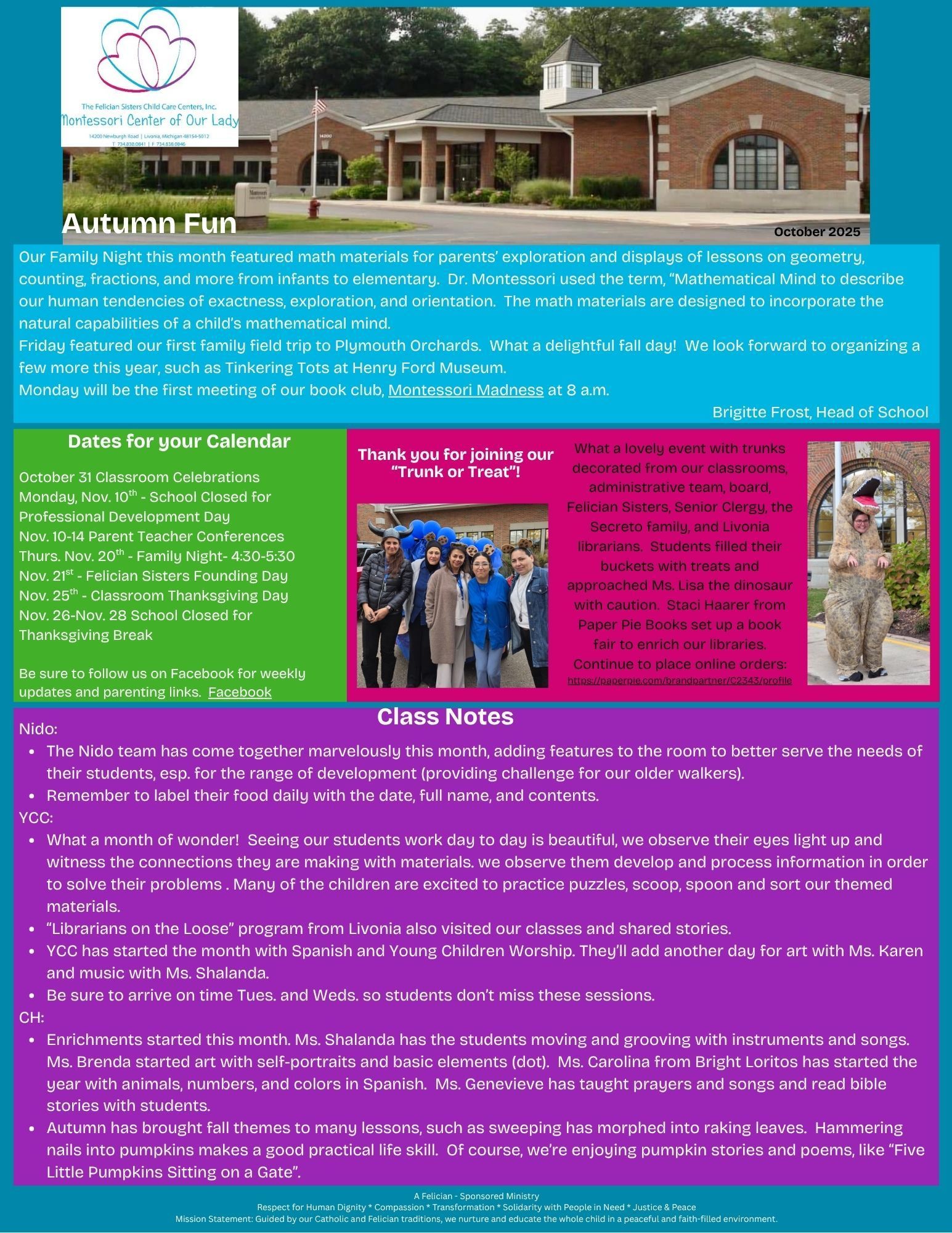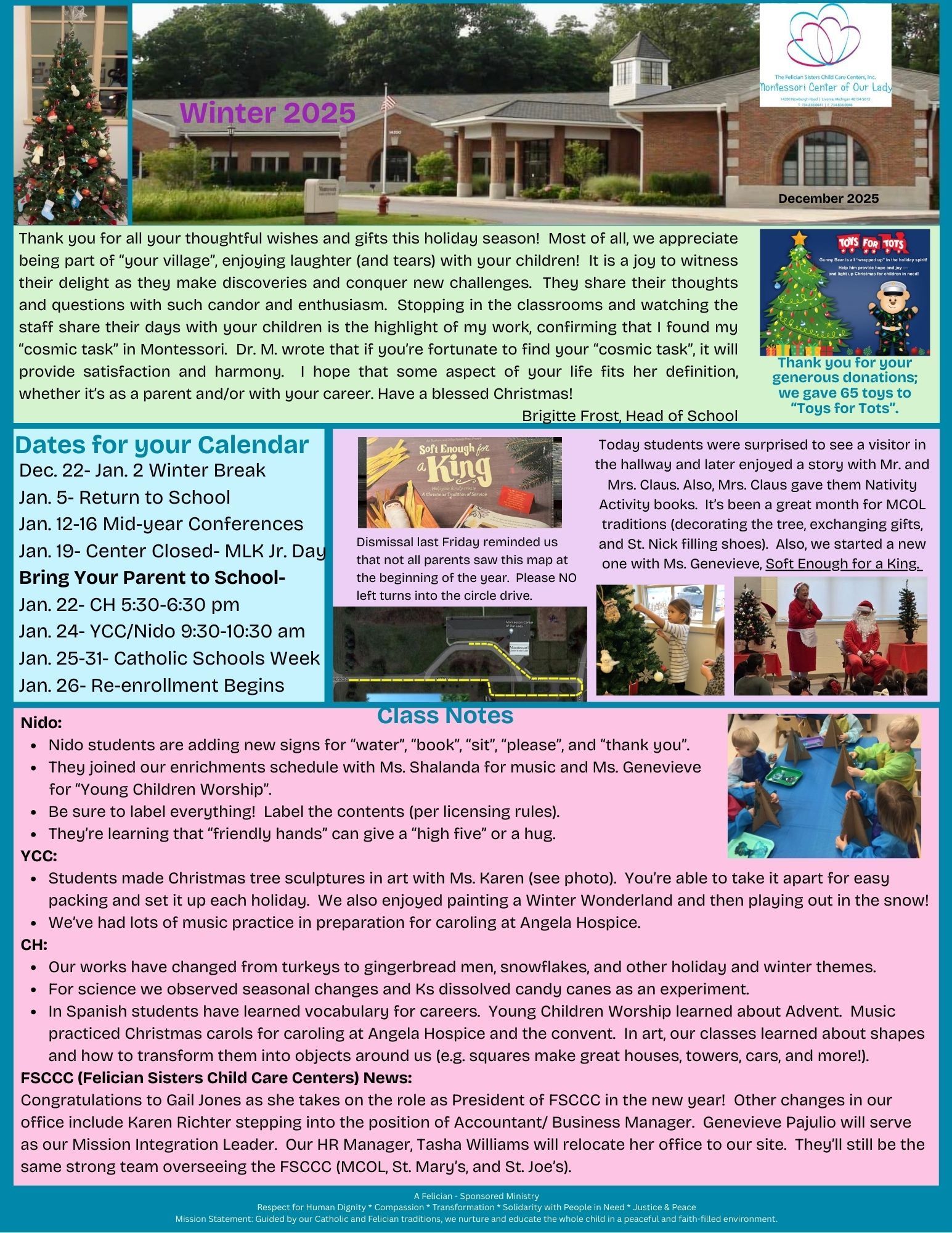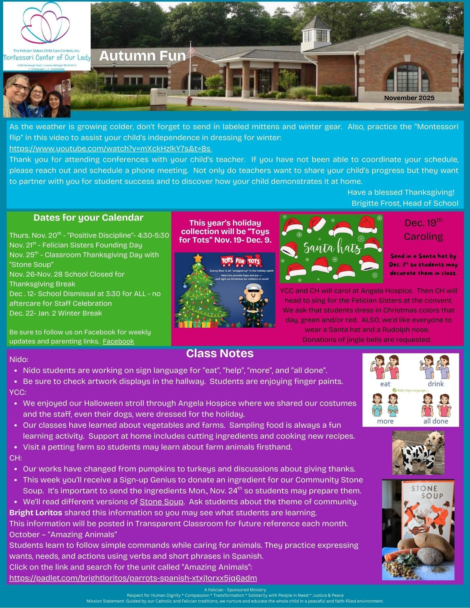 Happy December, MCOL families! As we bring the spirit of the Thanksgiving holidays to a close and begin to usher in the wonder of Christmas, I wanted to share a few of the things our team feels grateful for at this time of the year – Our team's expressions of gratitude must begin with each of you believing in our Felician-Sponsored ministry, aka Montessori Center of Our Lady, and choosing us to start your child's educational journey. For that, we extend heartfelt gratitude. We would not exist without the Felician Sisters' dedication, commitment, and desire to bring a Catholic Montessori school to Livonia. For three years, we have added new programs to the changing needs you have expressed. We have introduced our Nido (infant), Young Children's Community (toddlers), and our Elementary (first thru sixth grade) programs to a campus that previously served children ages three thru kindergarten exclusively. We are grateful for the opportunity to honor the Felician Sisters Core Value of Transformation as we bring the programs to our MCOL community that you need to make your professional and personal lives work. We are grateful to have come through the pandemic without having to close our center permanently, as happened to so many other centers, and keep our operating hours intact to the best of our ability. Lastly, but of equal importance, we are grateful for us and our work as a team, learning and growing together and individually. Our newest team members are enthusiastic contributors to all we do with our students. Our returning MCOL team members light the path that allows us to do our best for the children we serve as we combine our team member's many talents on behalf of the children we serve. Let’s take a look at the adaptation and refinement processes of the ages we serve (infants through sixth grade). We begin with a look at our Nido program.