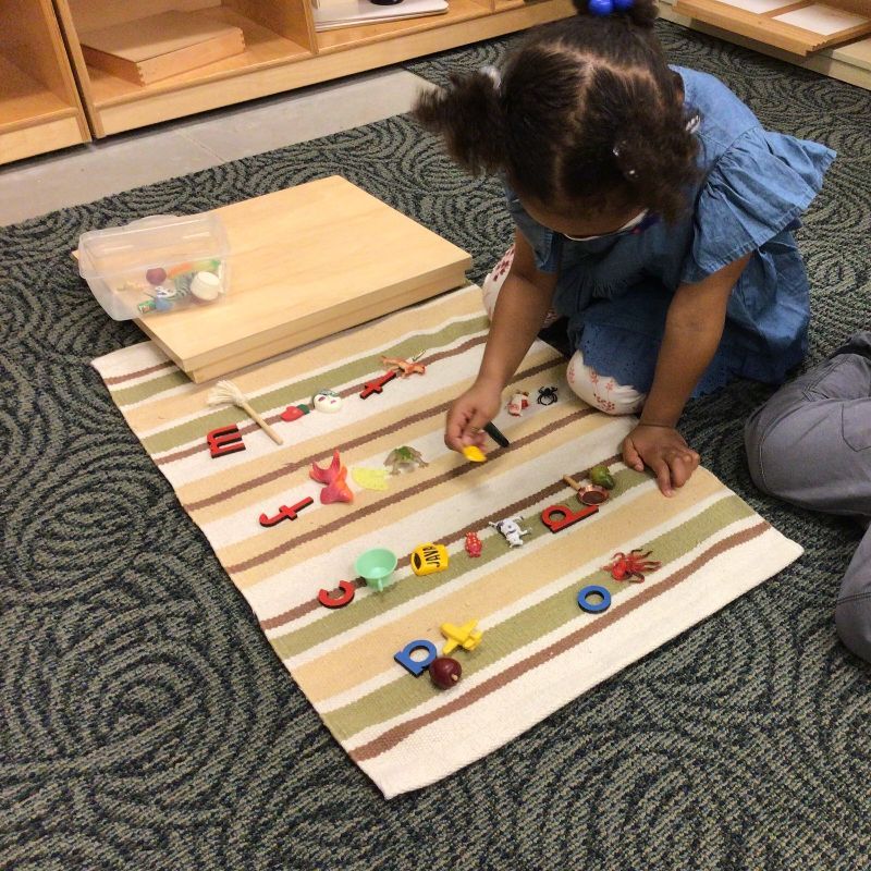 Montessori language lessons begin with early language concepts such as categorizing, finding the things that are the same, different, sequencing what comes first, second, third, etc. As the child masters those lessons, we introduce the sandpapers letters, and the child begins tracing the letter and learning the accompanying phonetic sound. Once a child knows the first eight phonetic sounds, we invite them to identify the initial sound in a word. We do this using small objects, which naturally draw the young child. In the photograph above, we see the child has placed (from left to right) the letter sounds she now knows across the top of her rug. Next, one object at a time, she selects an object, says the object's name aloud, isolates the beginning phonetic sounds, and places the object under the correct letter. When done, she will invite her teacher to sit with her while she moves through the placement of each object, demonstrating her ability to identify the beginning phonetic sound.