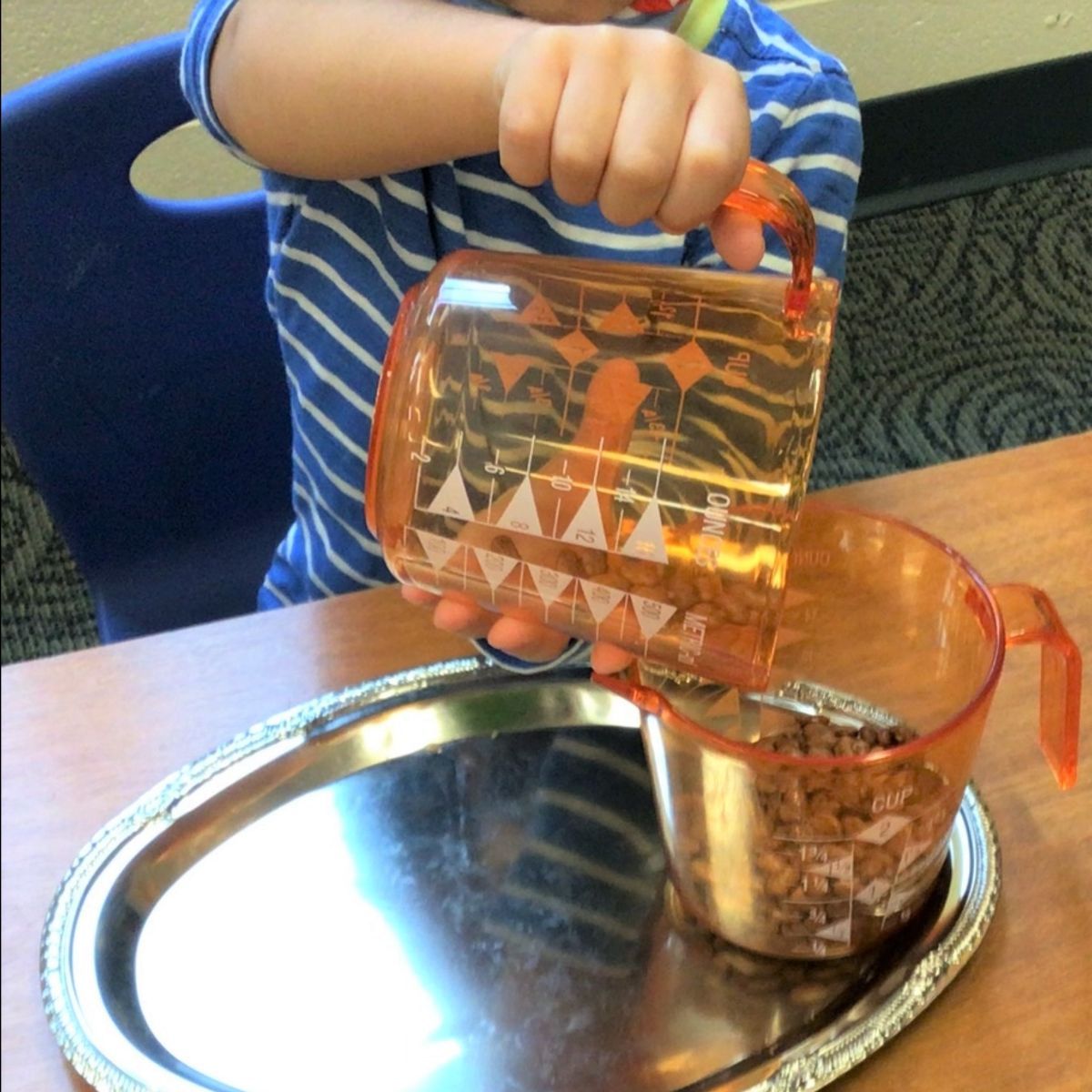 Did you know our Practical Life areas of each Children’s House classroom is the foundation of the program as a whole? It’s true! It is through the exercises of Practical Life that a child develops and strengthens their functional independence, sense of external and internal order, gross and fine motor coordination, concentration, and sense of personal competence. Each exercise teaches the child a specific skill that is first isolated to the work itself and over time to purpose real life work in the classroom. In the photograph below (left), you see a child carefully pouring from one vessel to another. The child pours slowly and deliberately controlling the movements of their hand and arm so as not to spill. Pouring is one example of many others in the Practical Life area of our classrooms. Pouring is done with a wide variety of mediums that are both dry and wet. Examples of real life work in the classroom includes pouring their own water during snack or milk during lunch, watering the classroom plants or outdoor garden beds, pouring ingredients in a baking activity and more!