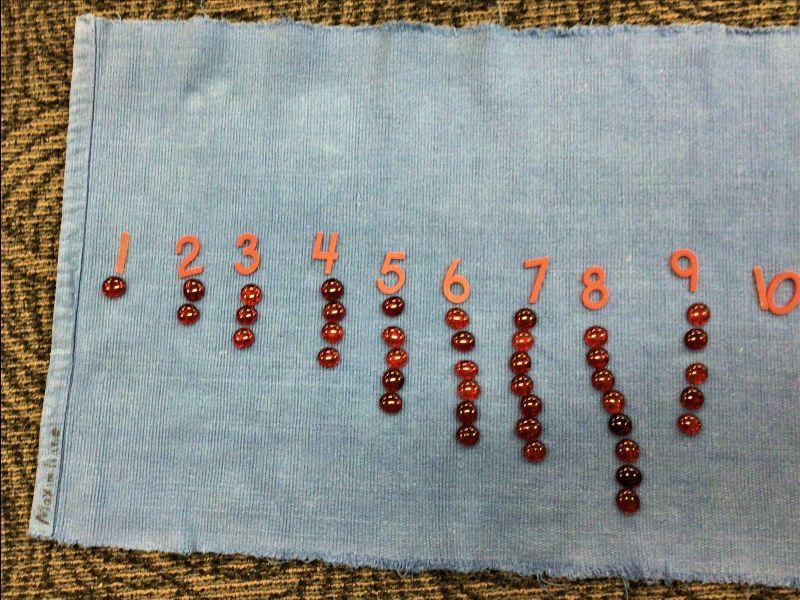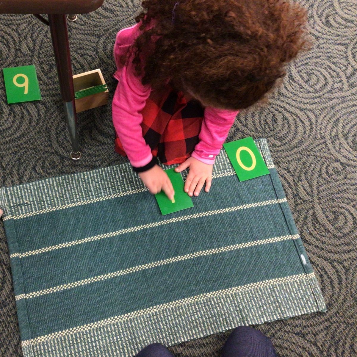 Montessori math approaches quantity and numerical symbols separately once the child has internalized the preparation needed for such concepts. Once the child has mastered quantity and the names attached to each amount and the numerical symbol with their names, the child is invited to associate the quantity and numerical symbol. In the photograph above (right), you see a child tracing a sandpaper numeral (one to be exact). Dr. Montessori used the muscle memory of the hands to assist students in their learning. We spend significant time with 1-10 as it is the base of the decimal system. The 1-10 materials (quantity and numerals) are larger in size as we prepare the child’s mathematical mind and become smaller as the work continues and the brain begins to organize itself for abstraction. Once the child masters 1-10 in all its forms within our classrooms, we introduce the decimal system. Our approach to education is not only the use of concrete materials to introduce abstract concepts, but we also introduce the whole of a topic first, followed by the parts, and then tie everything back to the whole.