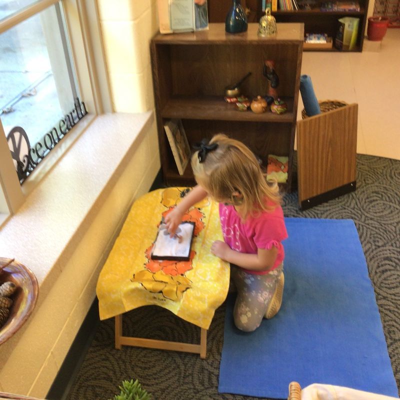 While not original to Dr. Montessori, our Children’s House environments have a Peace Corner. A place designed for one child at a time. A place where a child can be alone, regulate, or explore the calming work is the Peace Corner. Our Peace Corners are a favorite amongst our Children’s House classrooms for the sense of calm a child feels. You can see a child enjoying a quiet moment in the Peace corner while using a miniature Zen garden.